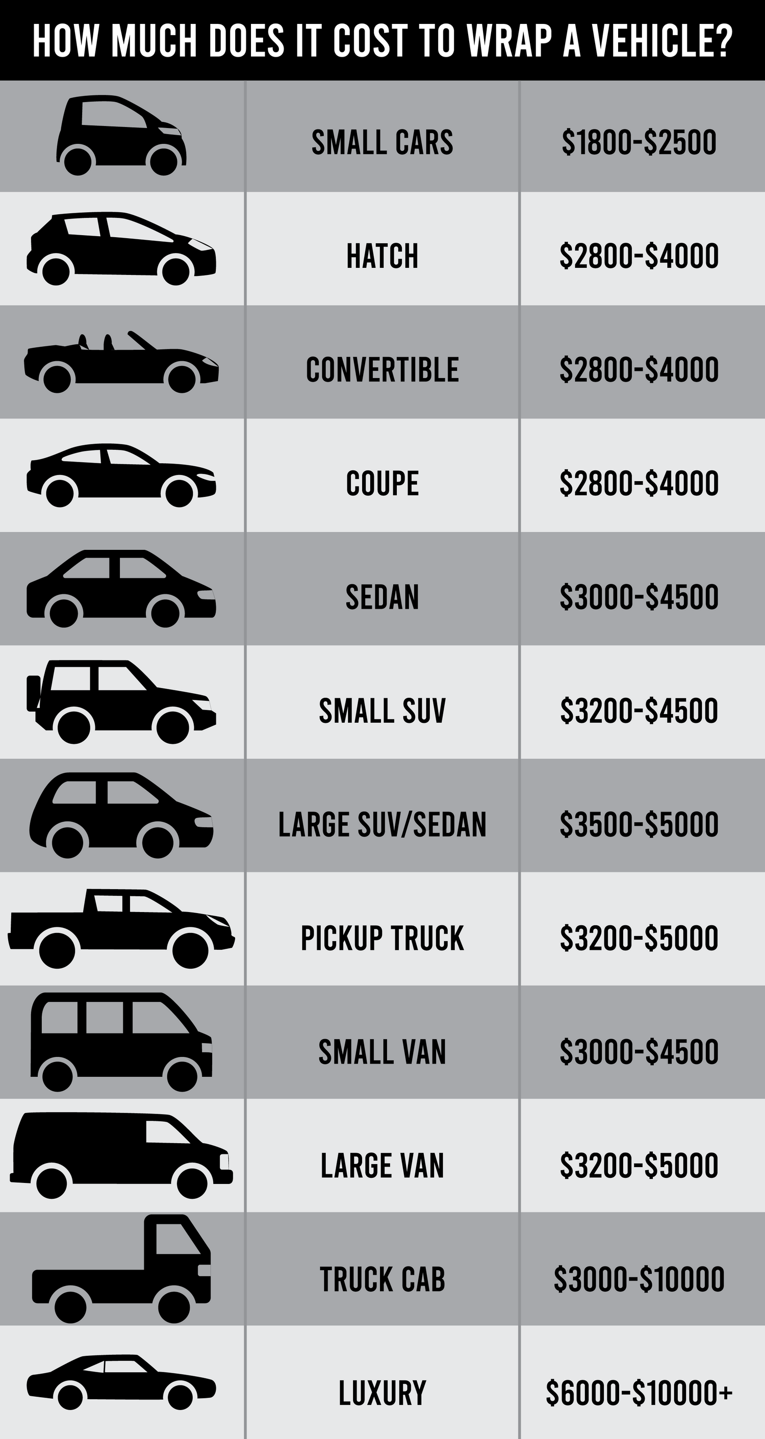 Between full printed wraps or color changes, costs vary and a lot of it factors into the size of the vehicle. These estimated costs are not final but give an idea of what to expect. Different materials and final decisions all make a difference.